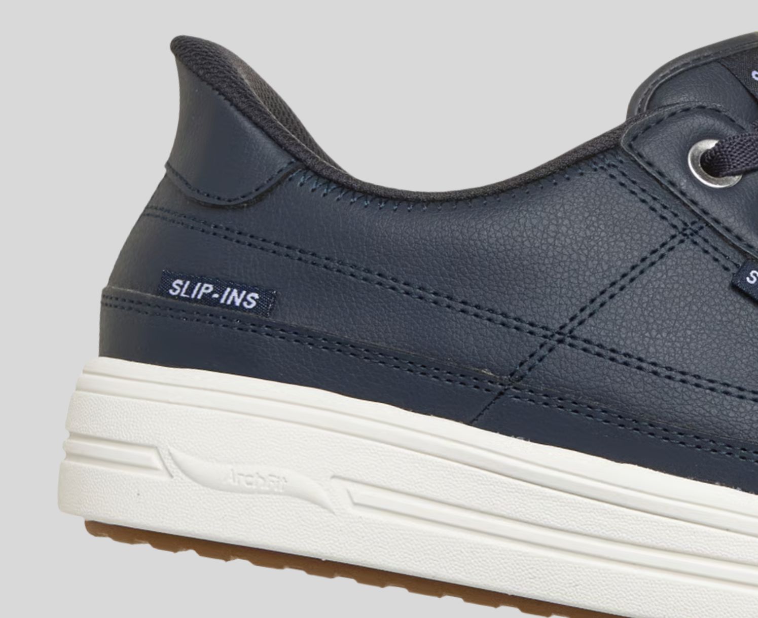 STEP-N-GOS Stroll through the day in amazing cushioned comfort wearing Skechers Street Hands Free Slip-ins®: Arch Fit® Arcade - Catch Ya There. Designed with our Heel Pillow®, this casual slip-on sneaker has been granted the APMA Seal of Acceptance and features a duraleather upper with fixed stretch laces, a removable Arch Fit® insole, and a lightweight cushioned midsole.