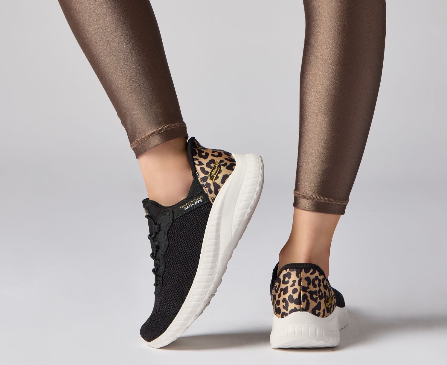 Step into athletic style and comfort wearing Skechers Hands Free Slip-ins®: BOBS Sport Squad Chaos - Seize The Hour. Designed with our exclusive Heel Pillow, this slip-on sneaker features a mesh upper with stretch laces, leopard print heel detail, and a cushioned Skechers Memory Foam insole.