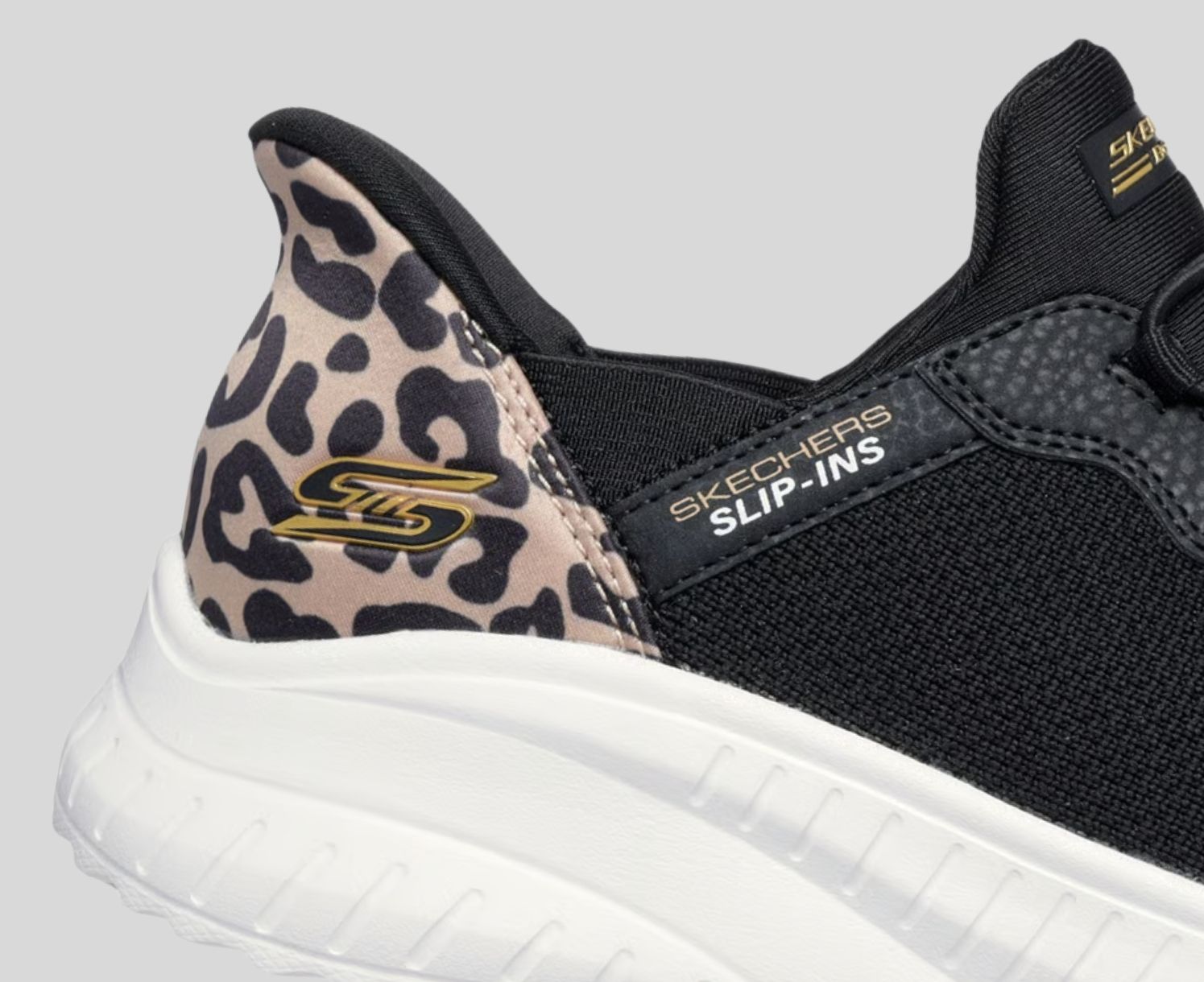 Step into athletic style and comfort wearing Skechers Hands Free Slip-ins®: BOBS Sport Squad Chaos - Seize The Hour. Designed with our exclusive Heel Pillow, this slip-on sneaker features a mesh upper with stretch laces, leopard print heel detail, and a cushioned Skechers Memory Foam insole.