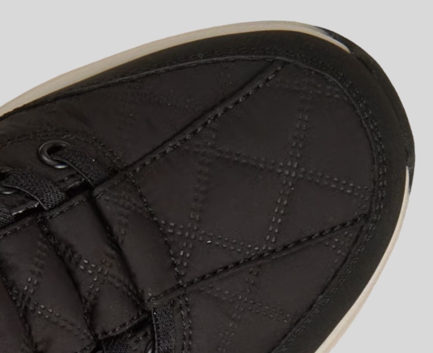 - Air-quilted mesh, duraleather, and leather upper with tied-off stretch laces