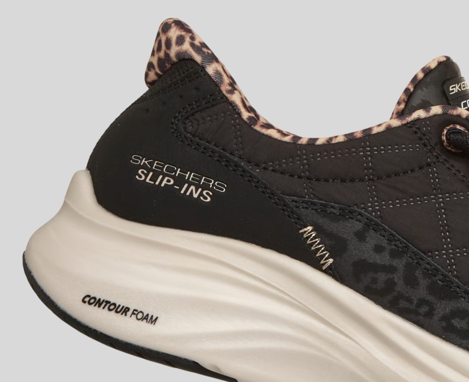 Step into fierce comfort and wild style with Skechers Hands Free Slip-ins®: Contour Foam - Cozy Fit® Leopard Dream. Designed with our Heel Pillow®, this slip-on style features a quilted Cozy Fit®, duraleather, and leather upper with tied-off stretch laces, Contour Foam midsole cushioning, and our signature cushioned Skechers Air-Cooled Memory Foam® insole.