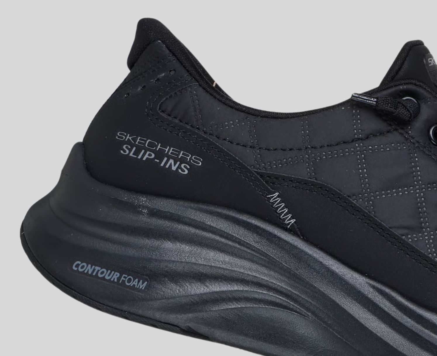 NO TIE FIT Surround your feet in effortless comfort wearing Skechers Hands Free Slip-ins®: Contour Foam - Cozy Fit®. Designed with our Heel Pillow®, this slip-on style features a quilted Cozy Fit® and synthetic overlay upper with tied-off stretch laces, Contour Foam midsole cushioning, and our signature cushioned Skechers Air-Cooled Memory Foam® insole.