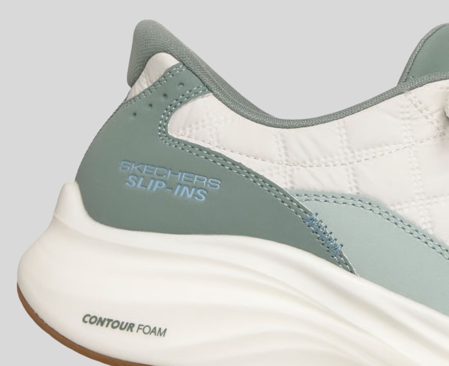 Surround your feet in effortless comfort wearing Skechers Hands Free Slip-ins®: Contour Foam - Cozy Fit. Designed with our Heel Pillow®, this slip-on style features a quilted Cozy Fit and synthetic overlay upper with tied-off stretch laces, Contour Foam midsole cushioning, and our signature cushioned Skechers Air-Cooled Memory Foam® insole.