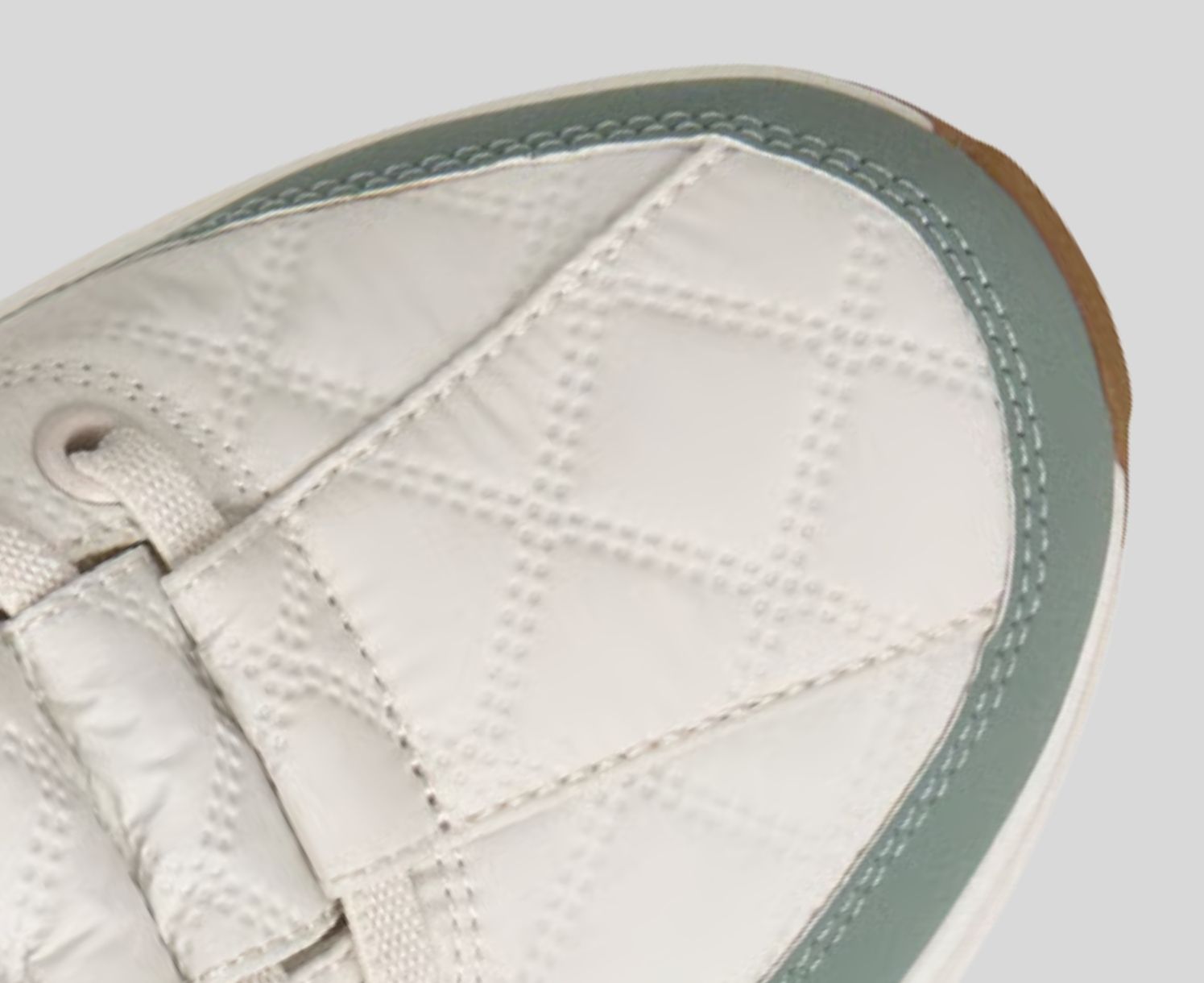 - Air-quilted fabric and synthetic overlay upper with tied-off stretch laces