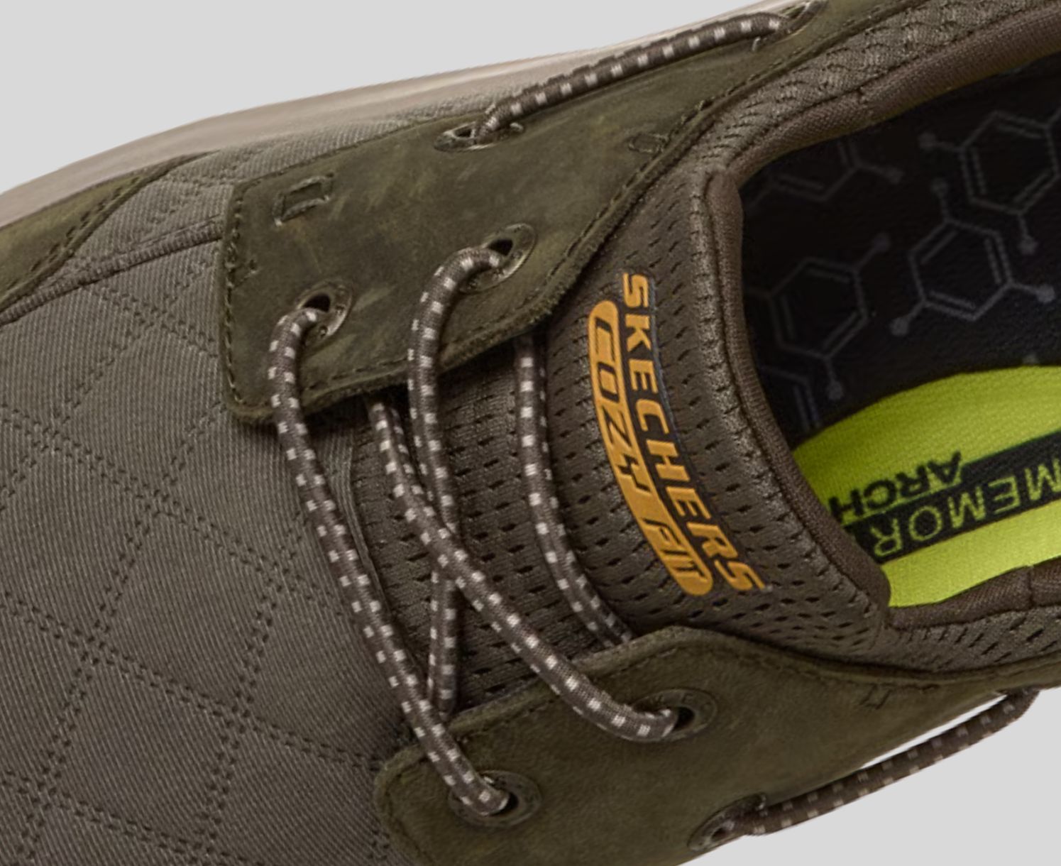 Skechers Cozy Fit® premium soft quilted materials wrap your feet in luxury, providing a cozy, natural fit for ultimate comfort.