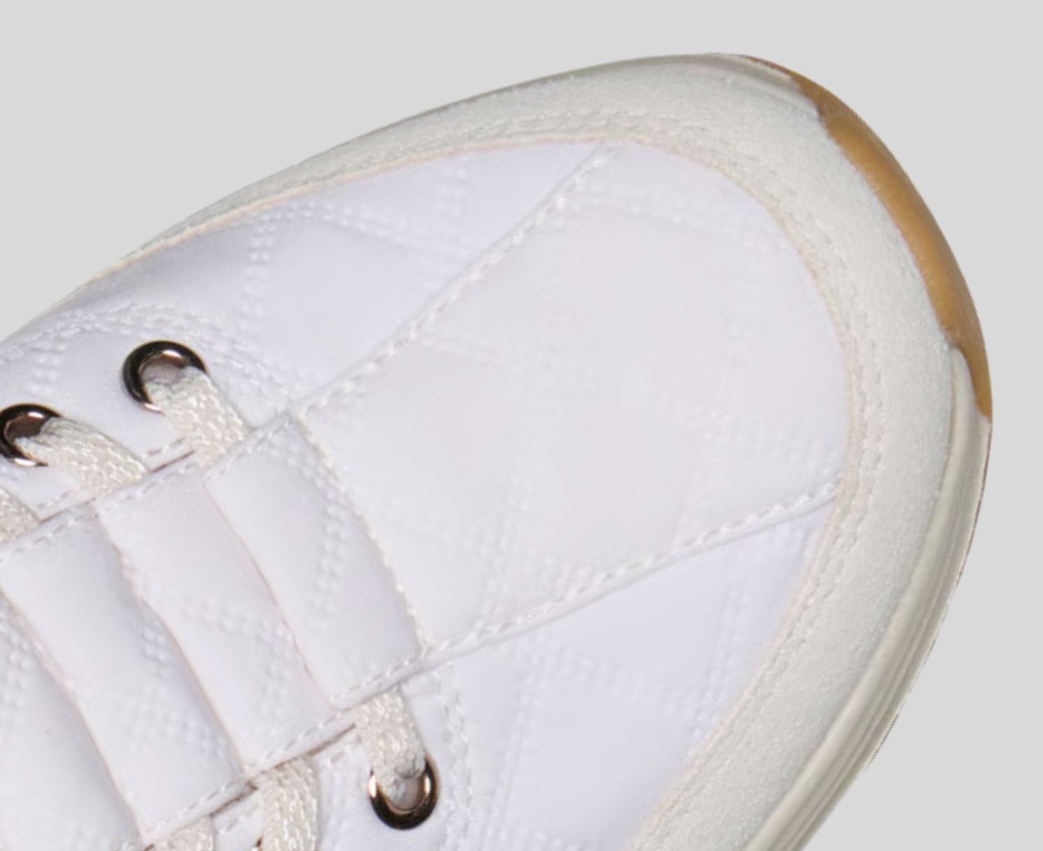 - Air-quilted fabric and suede overlay upper with tied-off stretch satin laces