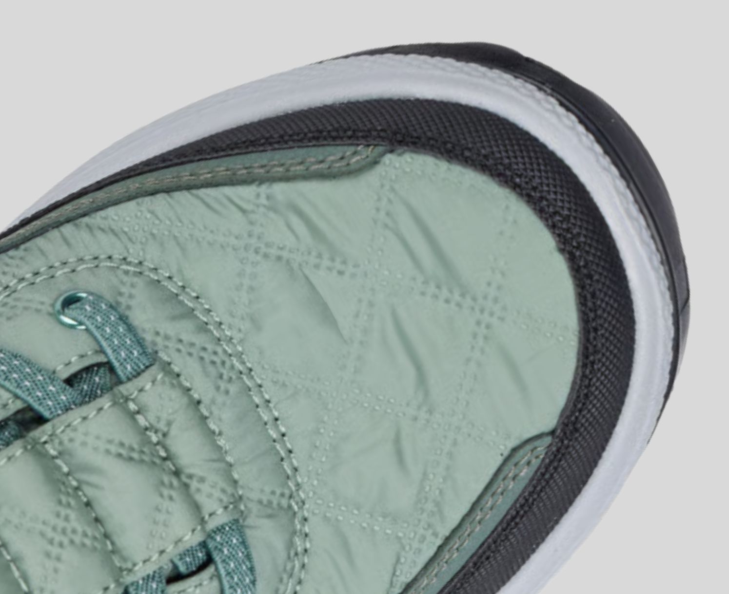 - Quilted fabric, synthetic, and leather upper with tied-off stretch laces