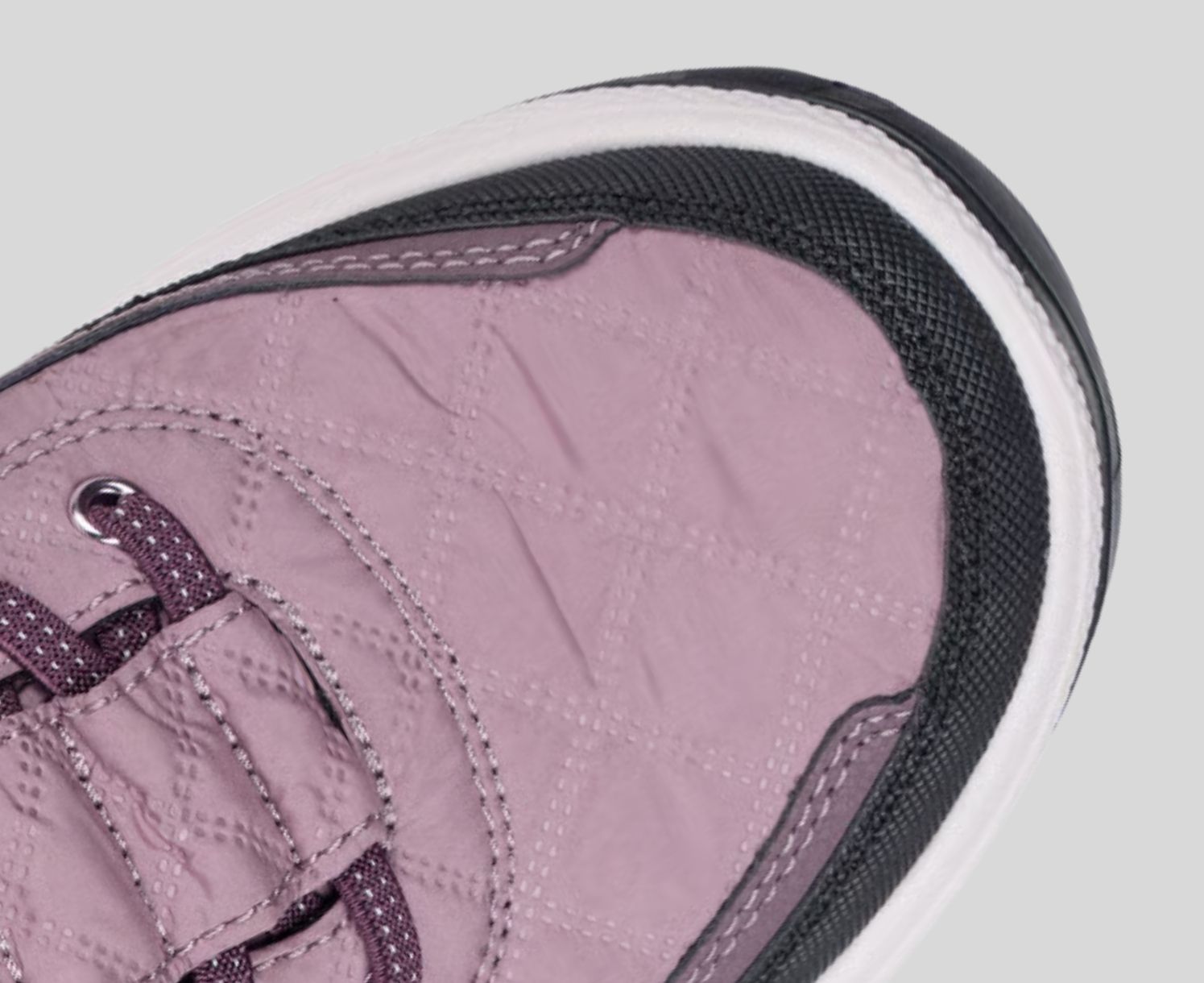 - Quilted fabric, synthetic, and leather upper with tied-off stretch laces
