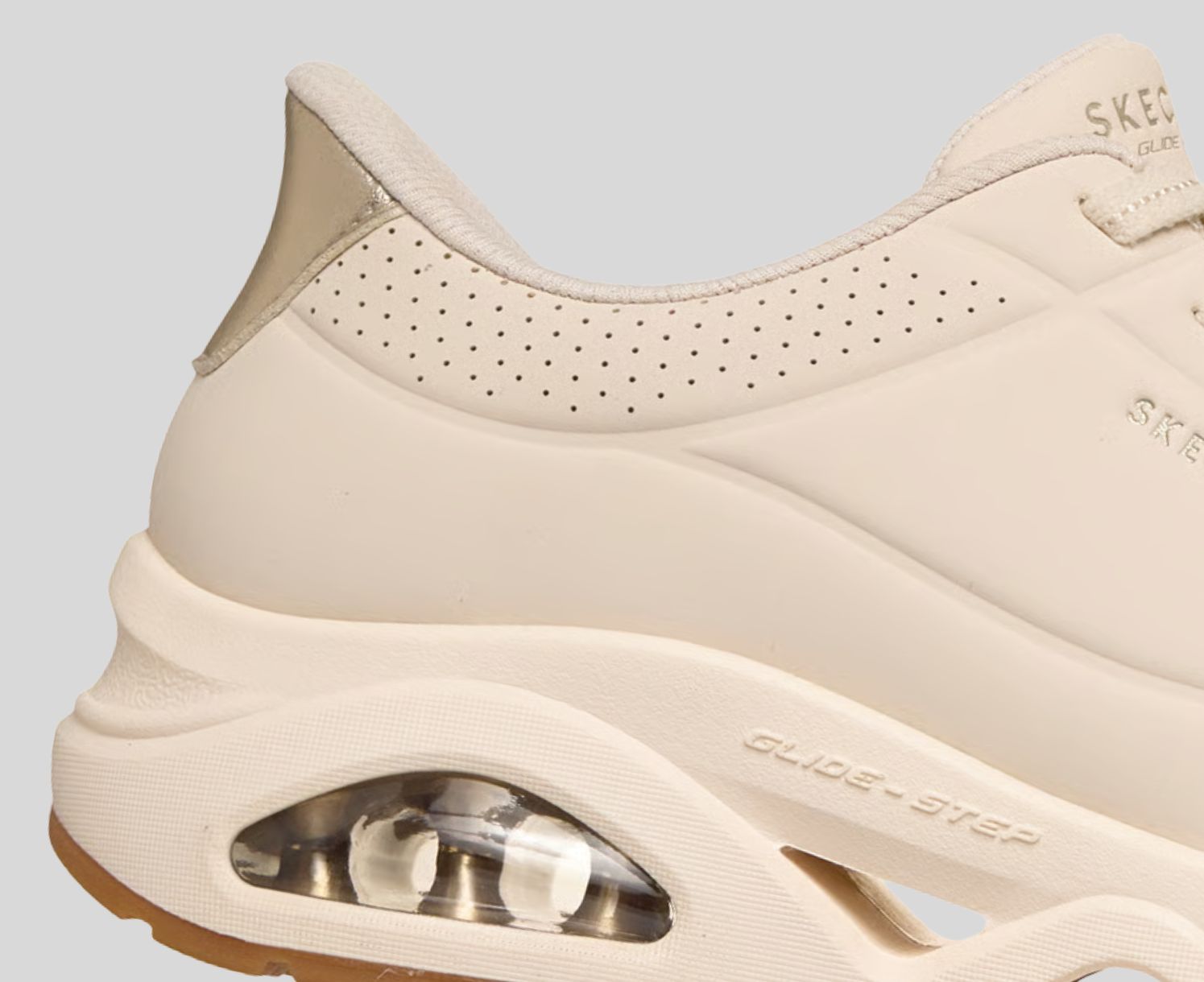 Walk on air in cloud-like comfort with Skechers Street Hands Free Slip-ins®: UNO Glide-Step® - Glide on Air. Designed with our Heel Pillow®, this stretch-laced slip-on features a duraleather upper with metallic heel detail, Glide-Step® geometric cushioned midsole, Skechers Air-Cooled Memory Foam® insole, and a visible Skech-Air® airbag midsole.