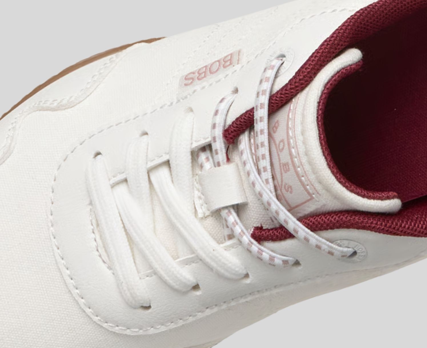 Tied-off decorative laces and an easy slip-on design. Laces never come untied.