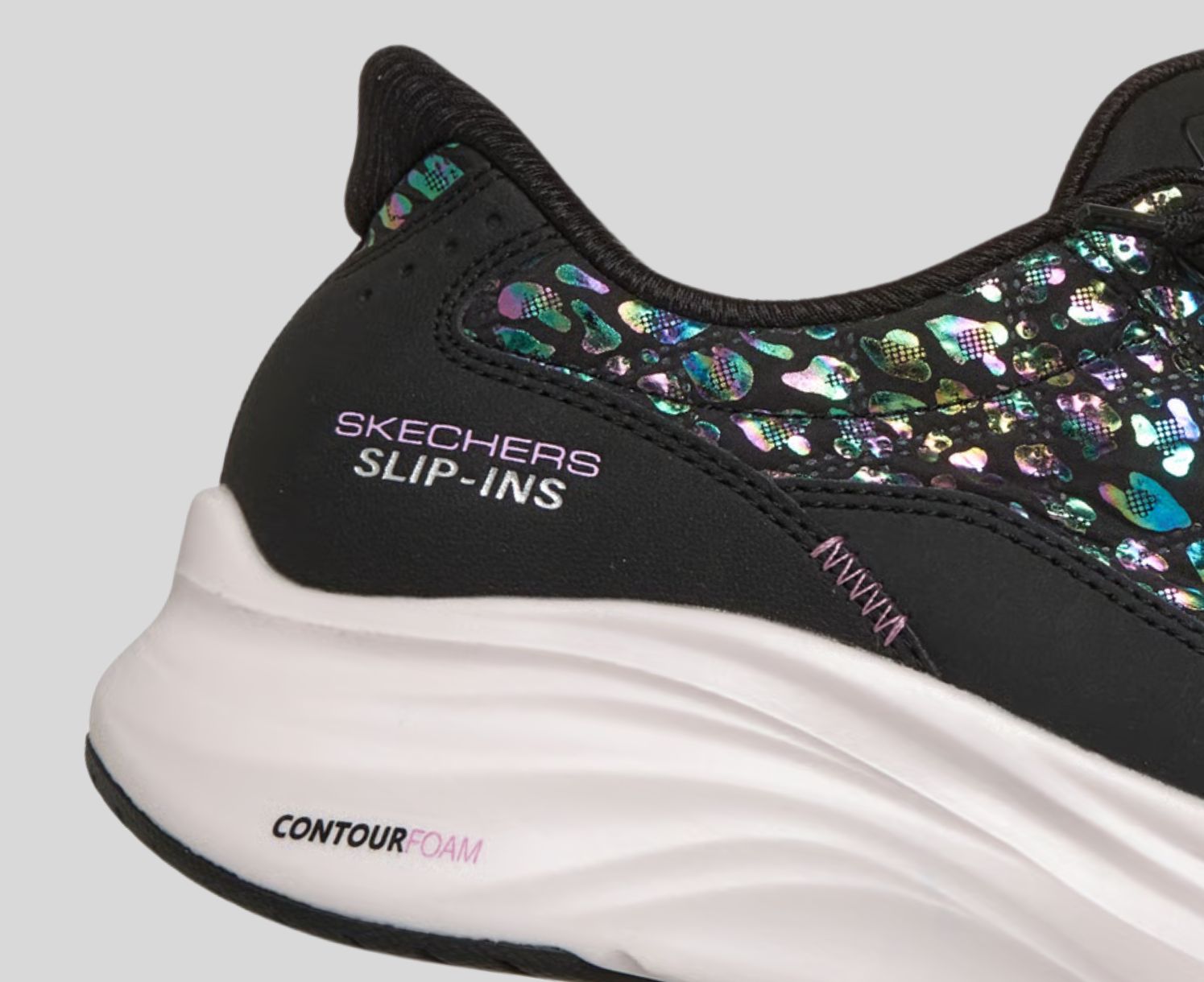 Alliez confort absolu et style audacieux avec la chaussure Skechers Hands Free Slip-ins® : Contour Foam™ - Cozy Fit™ Radiant Glow. Dotée de notre coussinet de talon Heel Pillow™, cette chaussure à enfiler et à lacets extensibles noués comprend une empeigne matelassée Cozy Fit™ avec imprimé de léopard iridescent avec superpositions en cuir durable et en cuir, un coussinet de semelle intercalaire Contour Foam™ et notre semelle intérieure emblématique Skechers Air-Cooled Memory Foam™ coussinée.