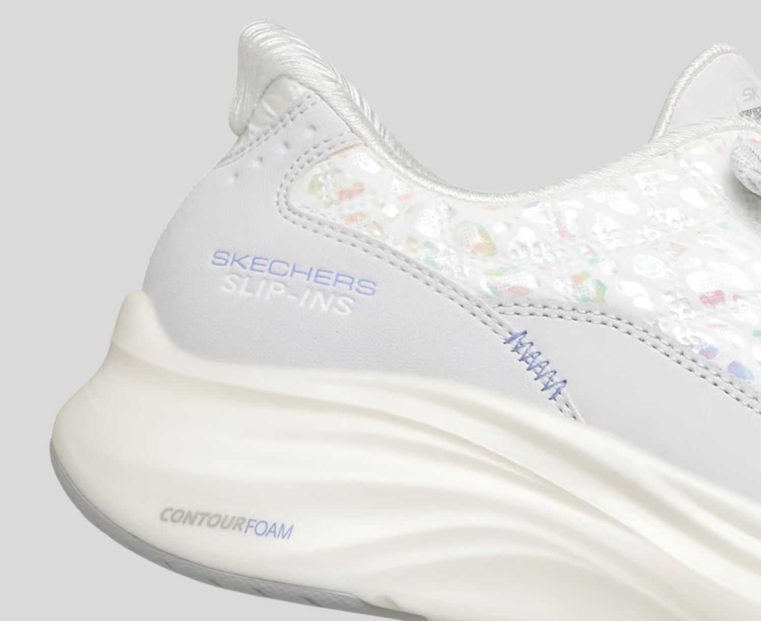 Alliez confort absolu et style audacieux avec la chaussure Skechers Hands Free Slip-ins® : Contour Foam™ - Cozy Fit™ Radiant Glow. Dotée de notre coussinet de talon Heel Pillow™, cette chaussure à enfiler et à lacets extensibles noués comprend une empeigne matelassée Cozy Fit™ avec imprimé de léopard iridescent avec superpositions en cuir durable et en cuir, un coussinet de semelle intercalaire Contour Foam™ et notre semelle intérieure emblématique Skechers Air-Cooled Memory Foam™ coussinée.