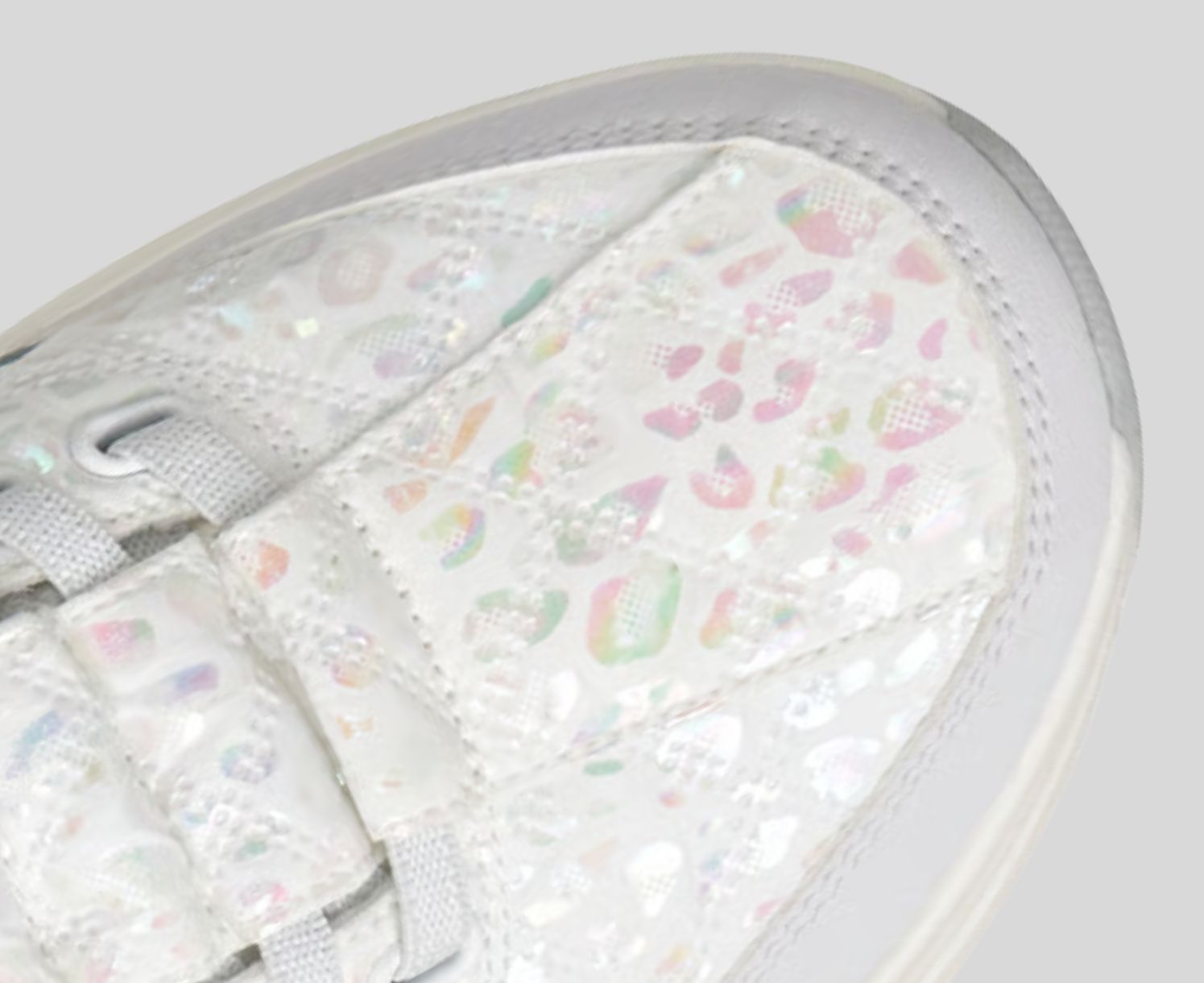 Tied-off decorative laces and an easy slip-on design. Laces never come untied.