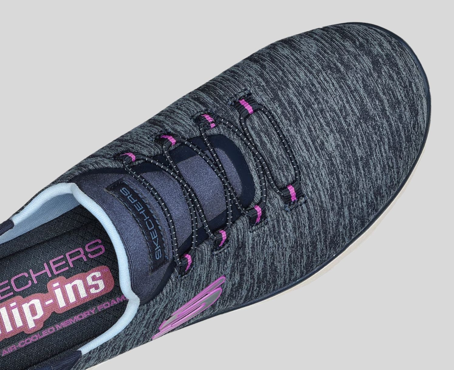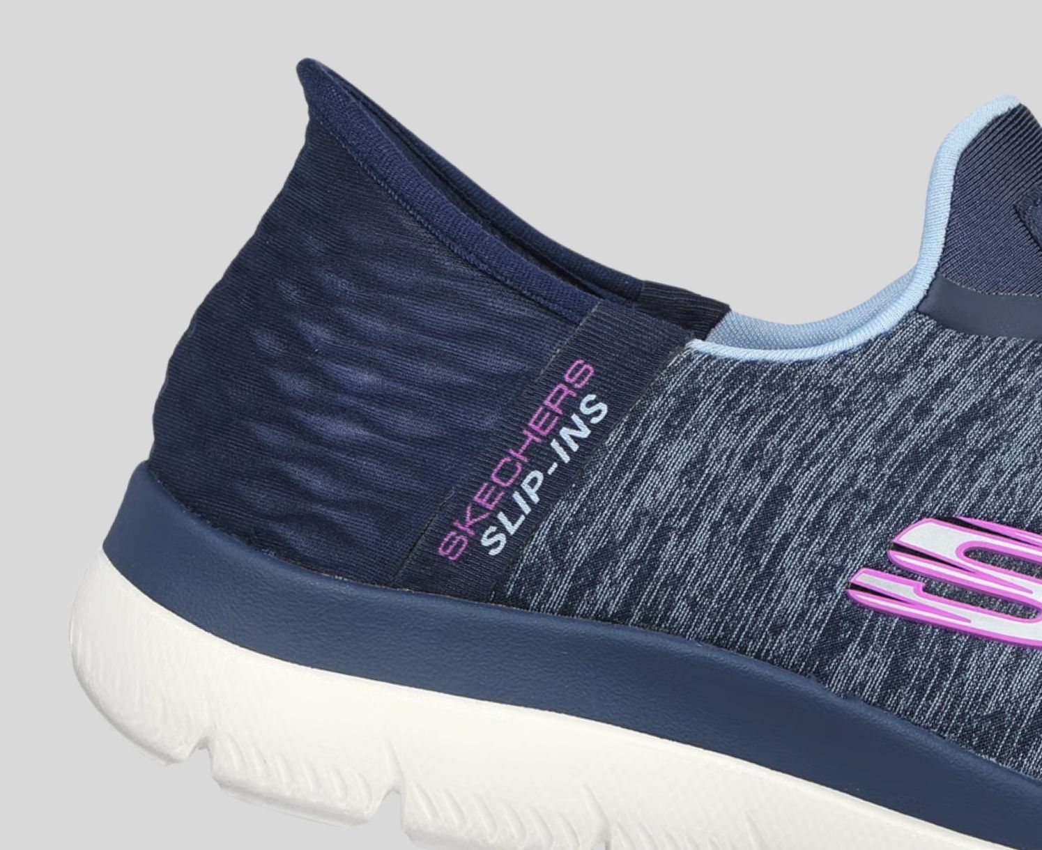 Accélérez le rythme grâce au confort supérieur de la chaussure Skechers Slip-ins® : Summits - Dazzling Haze. Dotée de notre coussinet de talon Heel Pillow™, cette chaussure végétalienne comprend une empeigne en tricot de jersey chiné doux, des lacets extensibles fixes et une semelle intérieure confortable Skechers Air-Cooled Memory Foam™.